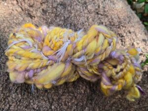 Handspun yarn sample plied with novelty yarn.